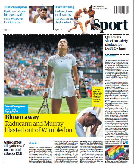 EPAاهتمت الصحف الإنجليزية الصادرة صباح اليوم الخميس، بوداع الثنائي أندي موراي وإيما رادوكانو المبكر لبطولة ويمبلدون للتنس من الدور الثاني، إلى جانب تسليط الضوء على اهتمام تشيلسي بالتعاقد مع كاليدو كوليبالي، مدافع نابولي.