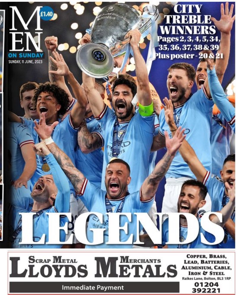 أما صحيفة "ديلي ستار" فكتبت: "أبطال": "مع وضع رقم 3 في الكلمة في إشارة إلى تتويج السيتي بالثلاثية.