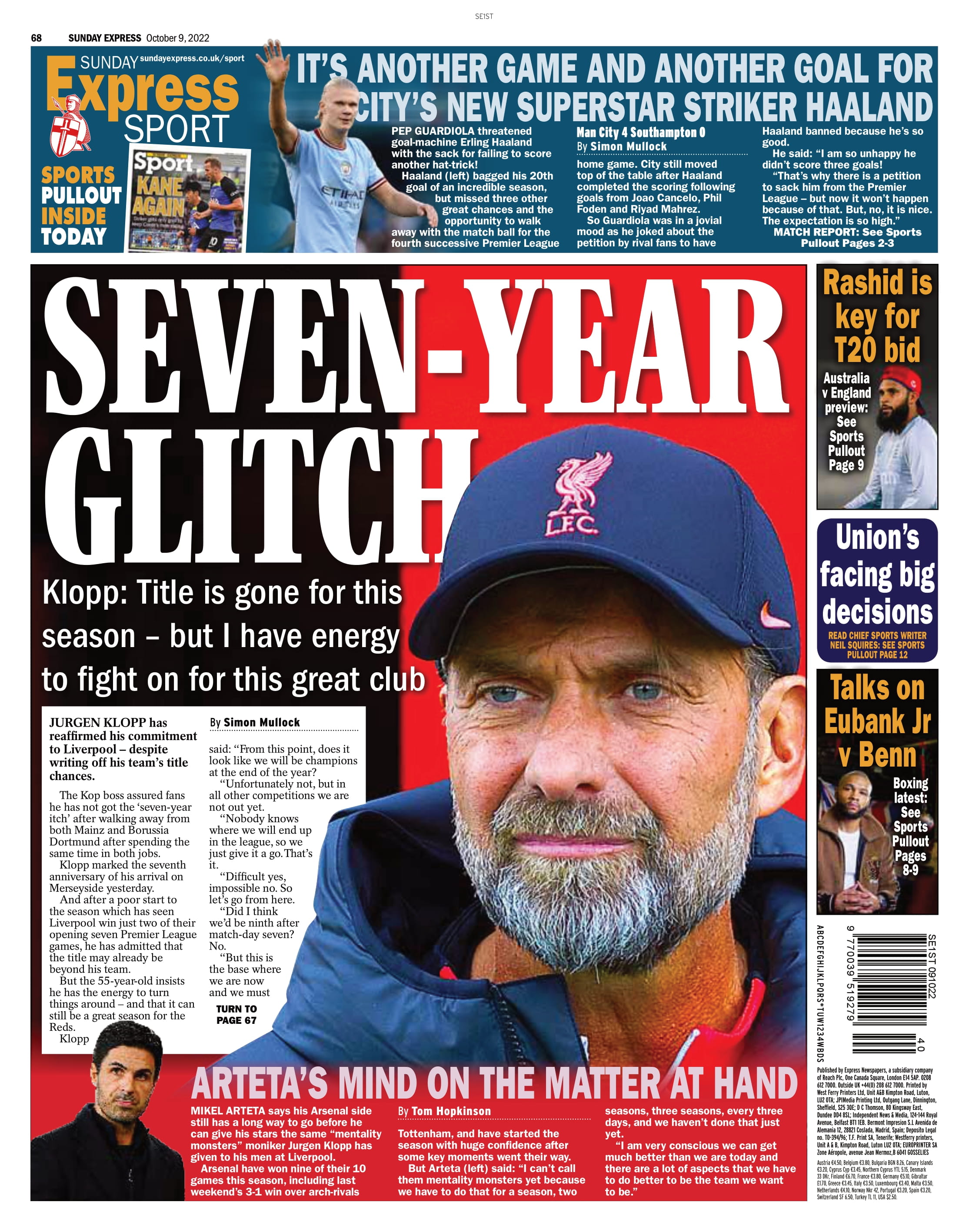 EPAاهتمت الصحف الإنجليزية الصادرة صباح اليوم الأحد، بمواصلة تألق إيرلينج هالاند التهديفي، في انتصار مانشستر سيتي أمس على ساوثهامبتون (4-0)، إلى جانب تسليط الضوء على استسلام يورجن كلوب، مدرب ليفربول، في سباق التتويج بلقب البريميرليج.