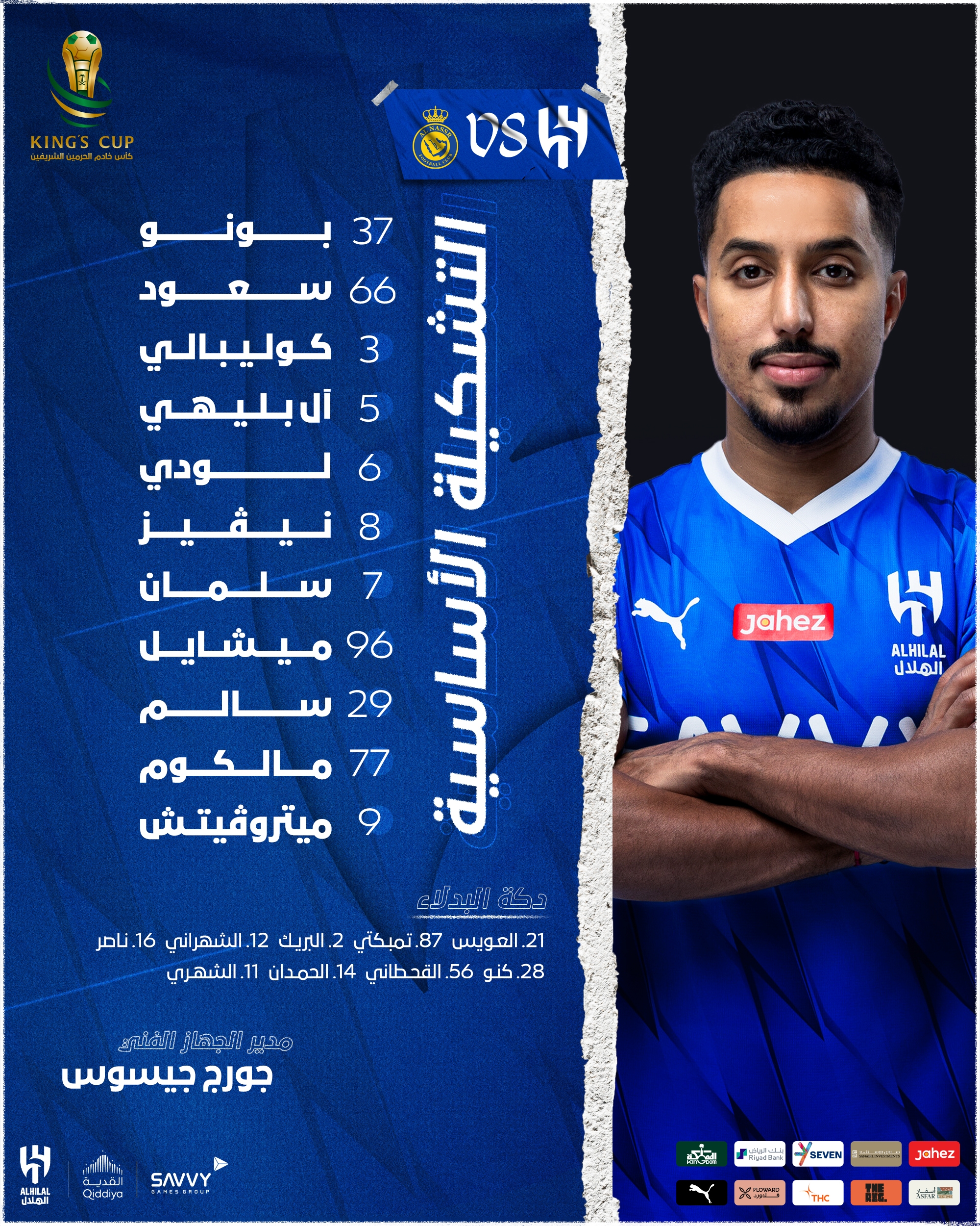 في المقابل، فإن الهلال يلعب المباراة بنفس العناصر المعتادة، بينما يفتقد فقط لاعب خط الوسط الصربي سيرجي ميلينكوفيتش سافيتش لحصوله على البطاقة الحمراء في المباراة الماضية ضد الاتحاد بنصف النهائي، فيما يعوّضه القائد سلمان الفرج.