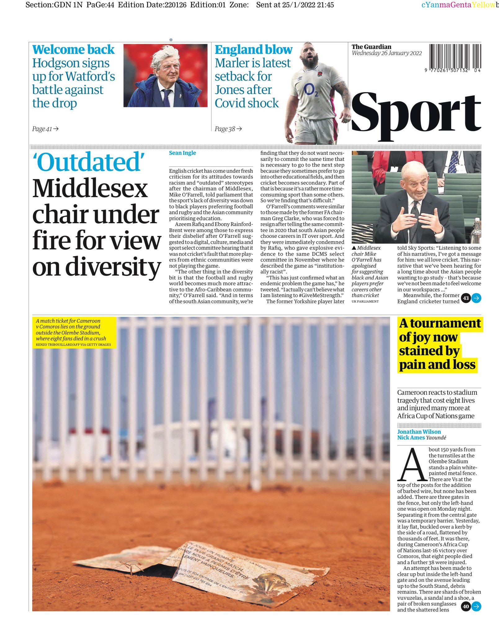 وبدورها عنونت "الجارديان": "بطولة الفرح تلطخ بالألم والخسارة"، في إشارة إلى حادث التدافع الذي أدى إلى وفيات بين الجماهير في كأس الأمم الأفريقية المقامة بالكاميرون.