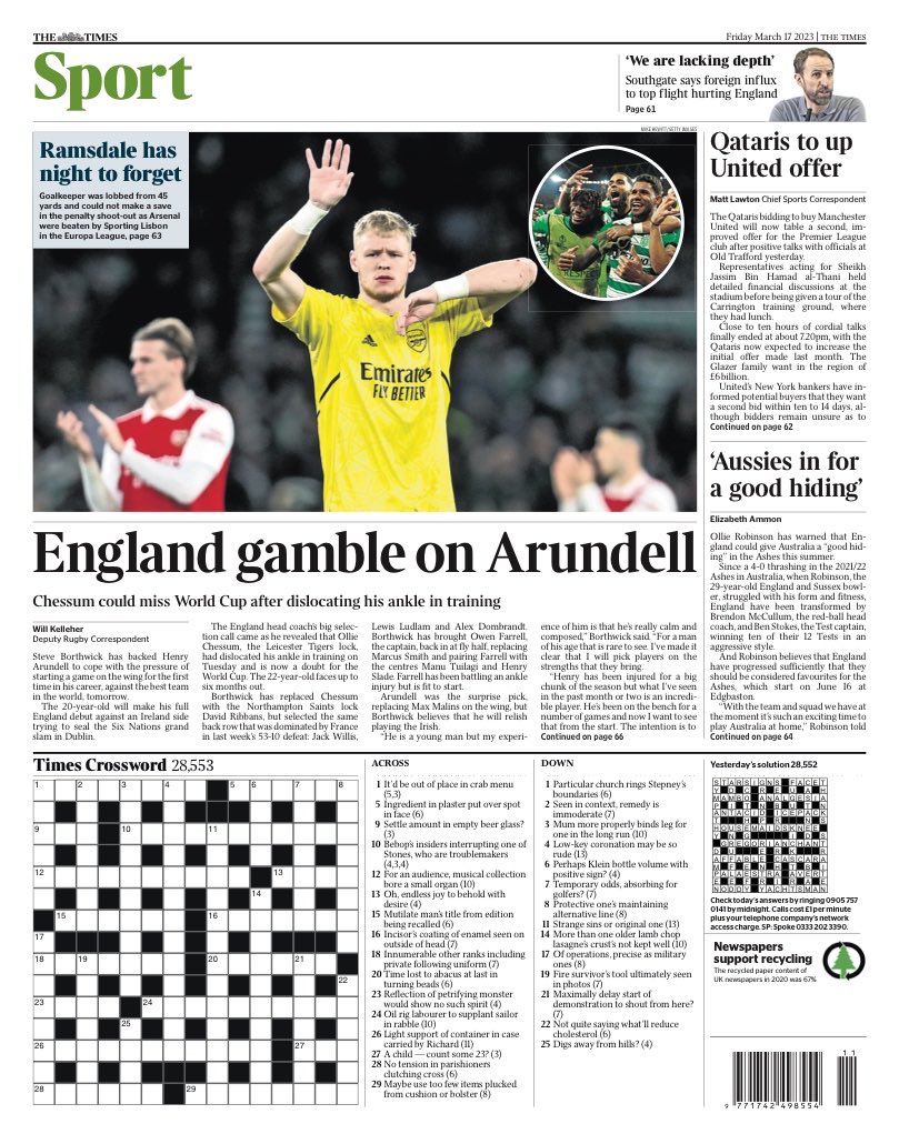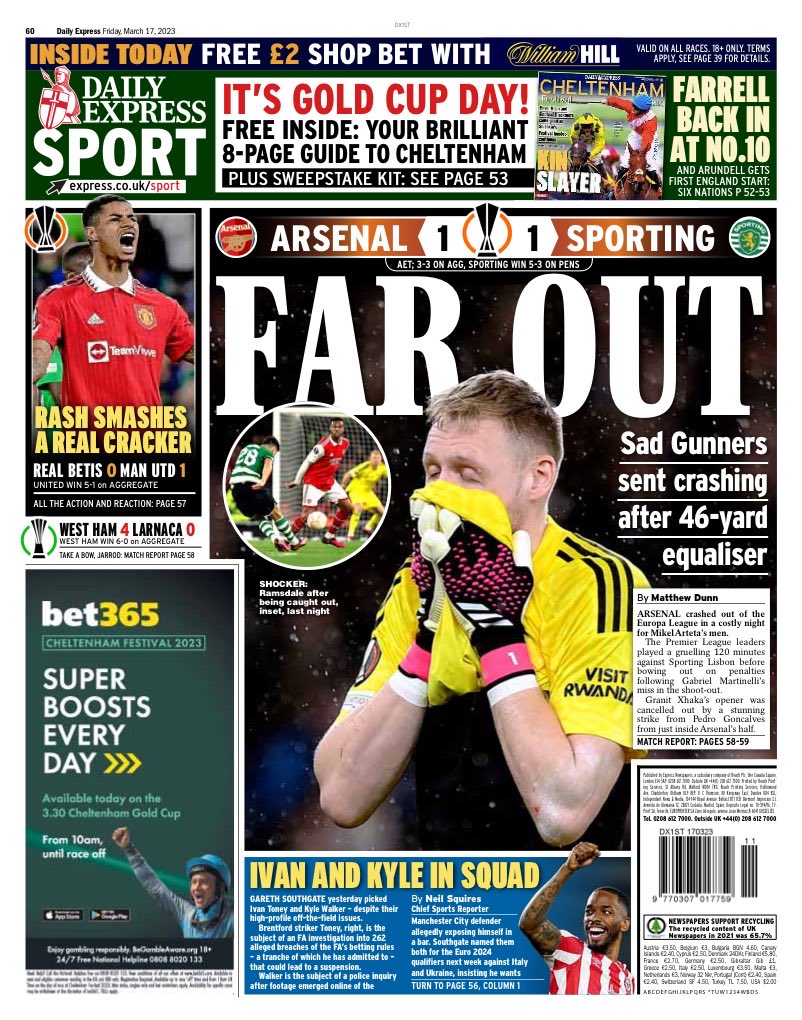 وبدورها عنونت صحيفة "التايمز": "أمسية للنسيان لرامسديل"، في إشارة إلى حارس آرسنال.
