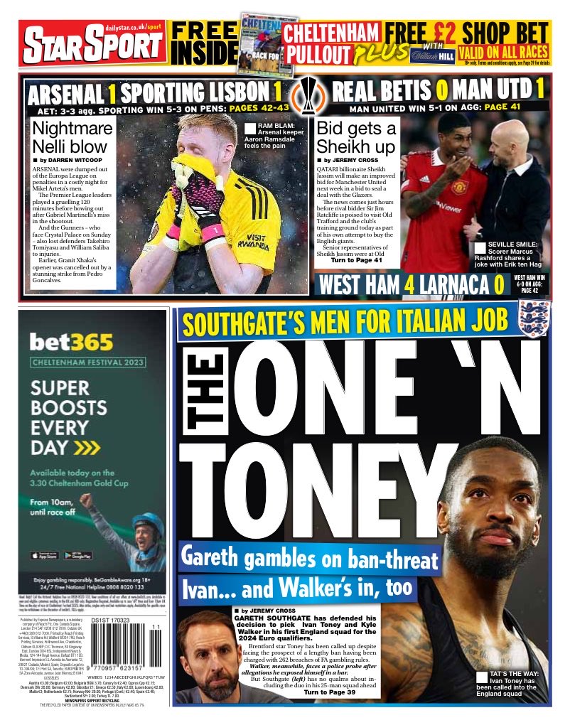 أما صحيفة "ديلي ستار" فعنونت: "جاريث يقامر بإيفان المهدد بالإيقاف.. وانضمام والكر أيضًا".