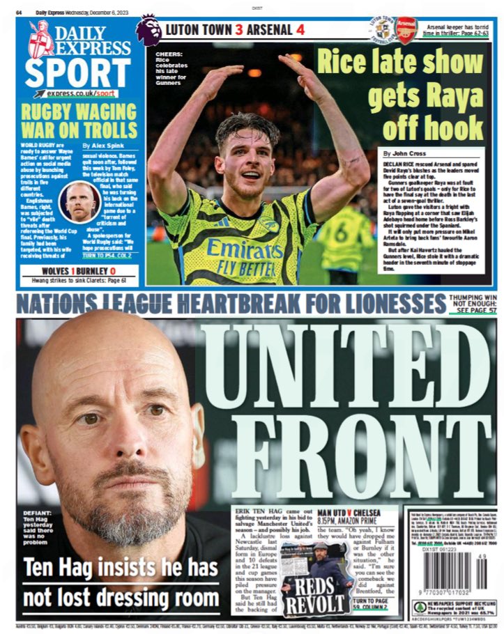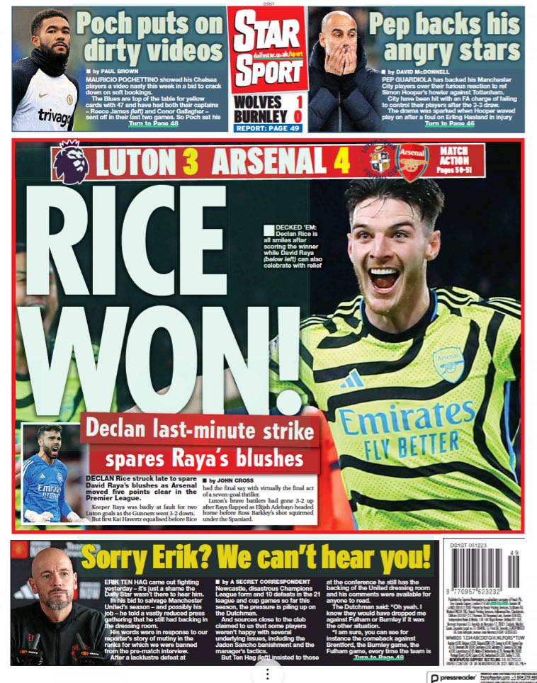 وعنونت صحيفة "ديلي إكسبريس": "عرض رايس المتأخر يخرج رايا من المتاعب"، في إشارة إلى هدف الفوز الذي سجله رايس في انتصار آرسنال على لوتون تاون في لقاء شهد العديد من الهفوات من حارس المدفعجية.