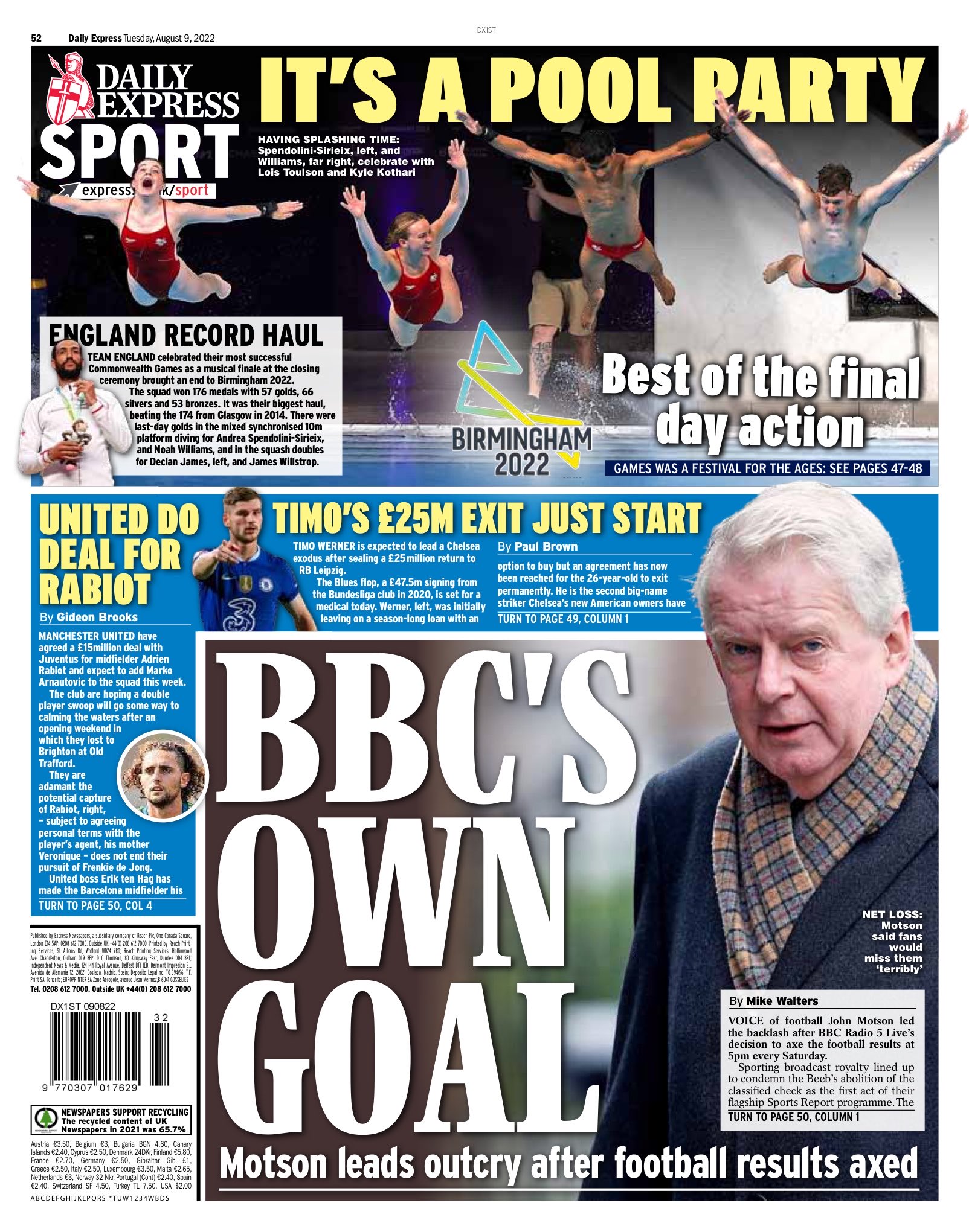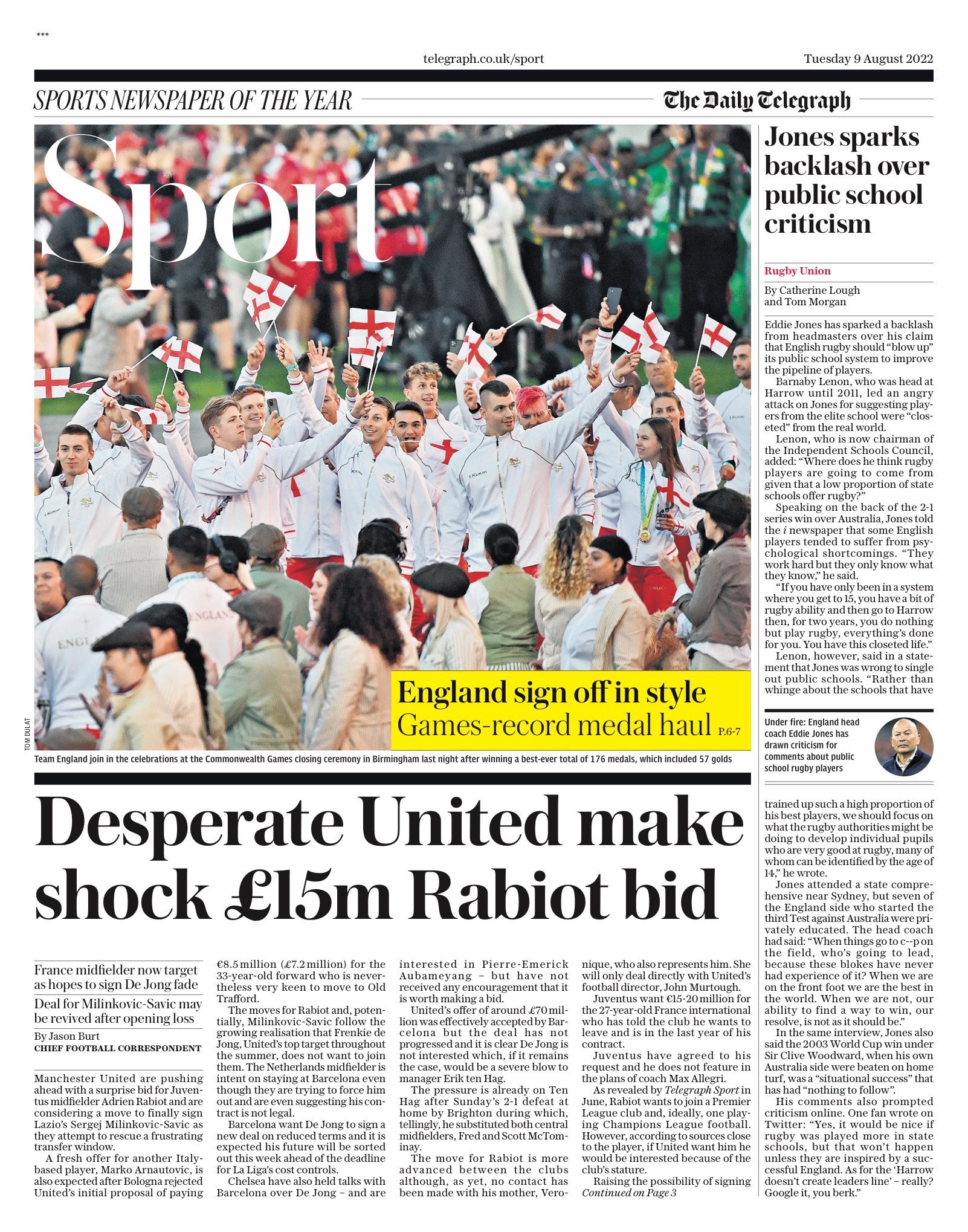 وعنونت صحيفة "ديلي إكسبريس": "اليونايتد يتوصل لاتفاق مع رابيو"، متوسط ميدان يوفنتوس، مقابل 15 مليون إسترليني.
