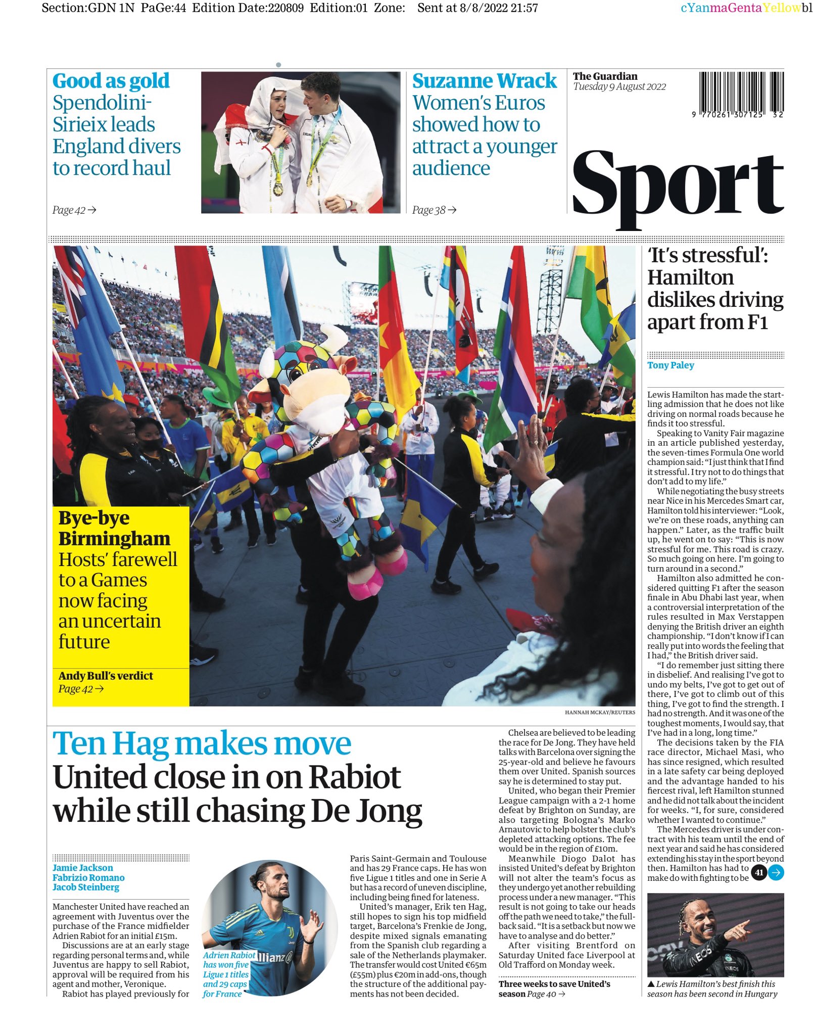 أما صحيفة "الجارديان" فعنونت: "تين هاج يتحرك.. اليونايتد قريب من رابيو وما زال يطارد دي يونج".