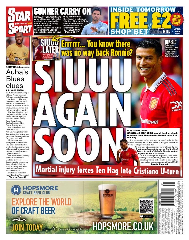 ومن جانبها عنونت "ديلي ستار": "إصابة مارسيال تجبر تين هاج على التراجع أمام كريستيانو".