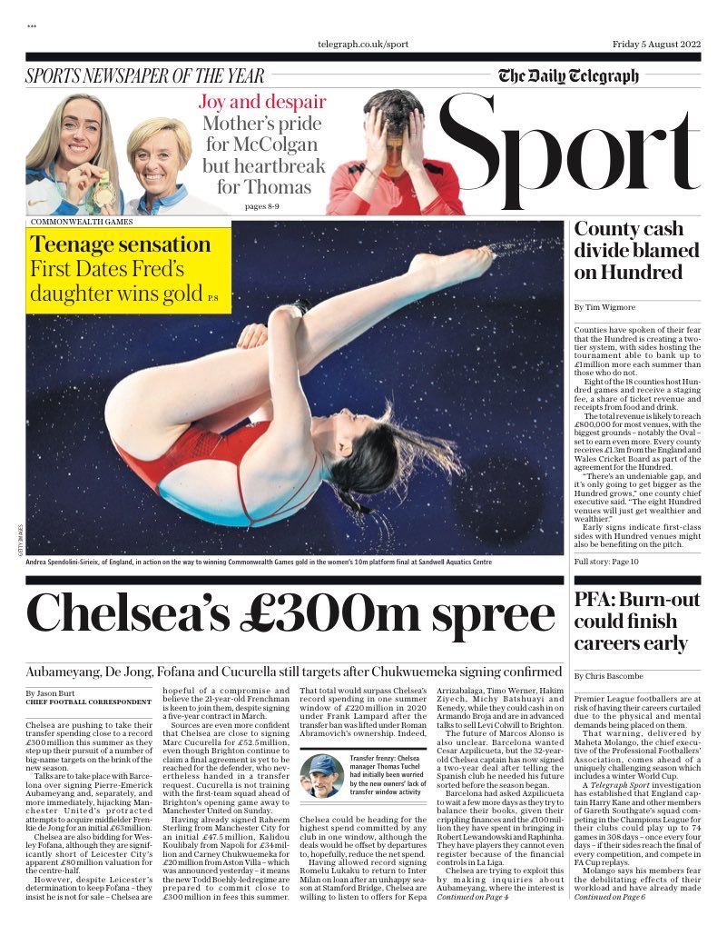 أما صحيفة "ديلي تليجراف" فعنونت: "ابتهاج تشيلسي بـ300 مليون إسترليني.. أوباميانج ودي يونج وفوفانا وكوكوريلا لا يزالوا أهدافًا بعد تأكد التوقيع مع تشوكويميكا".