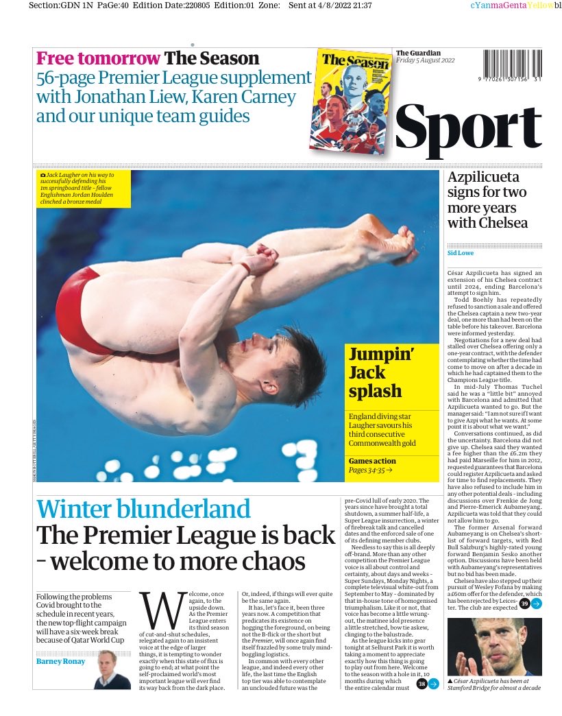 EPAاهتمت الصحف الإنجليزية الصادرة صباح اليوم الجمعة، بانطلاق منافسات البريميرليج اليوم، إلى جانب تسليط الضوء على اهتمام تشيلسي بضم المهاجم الجابوني بيير إيمريك أوباميانج من صفوف برشلونة.