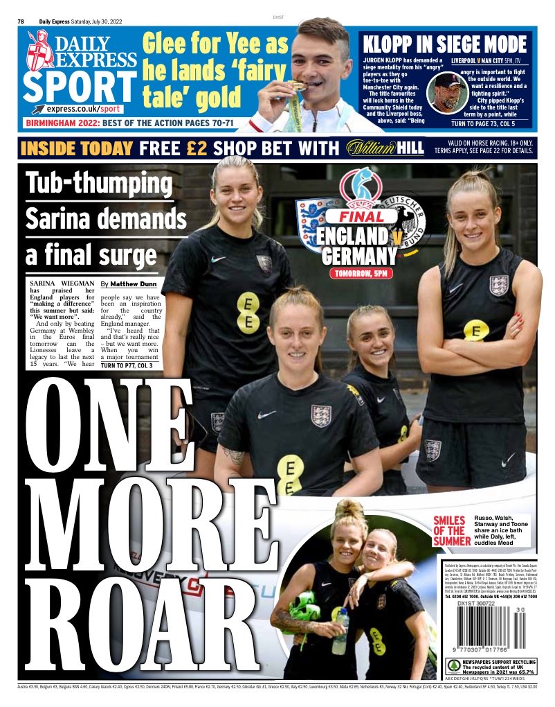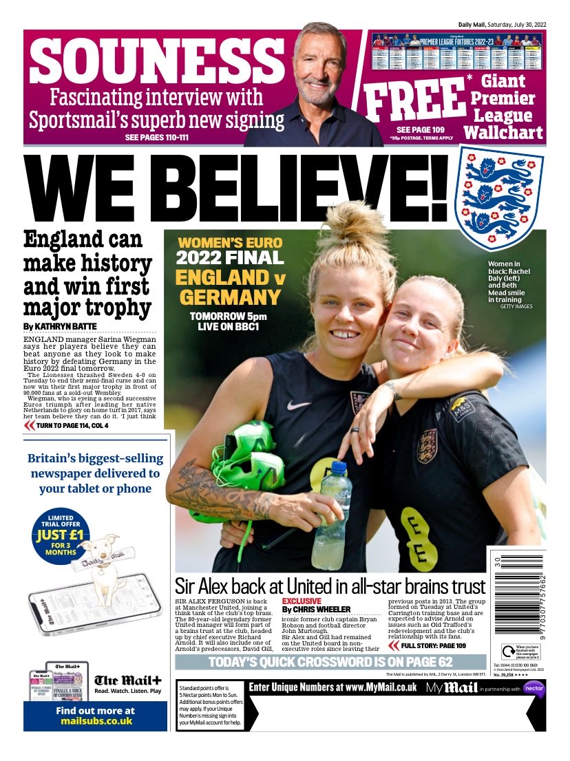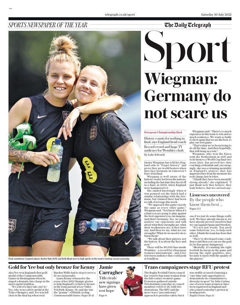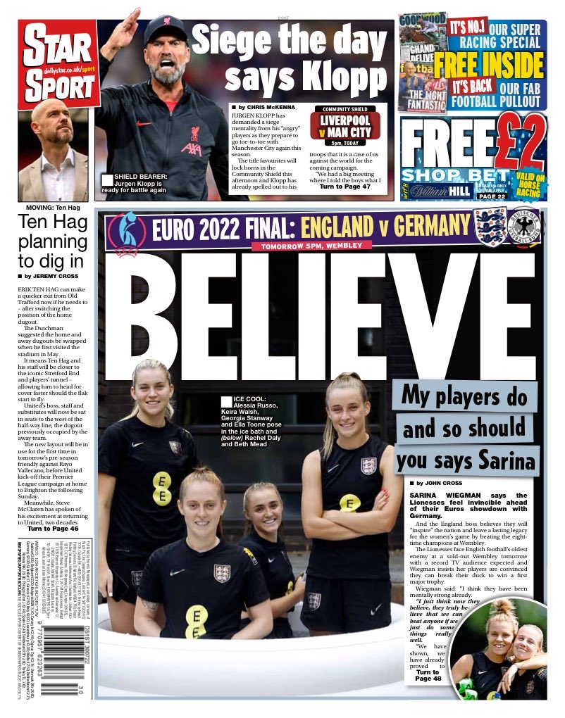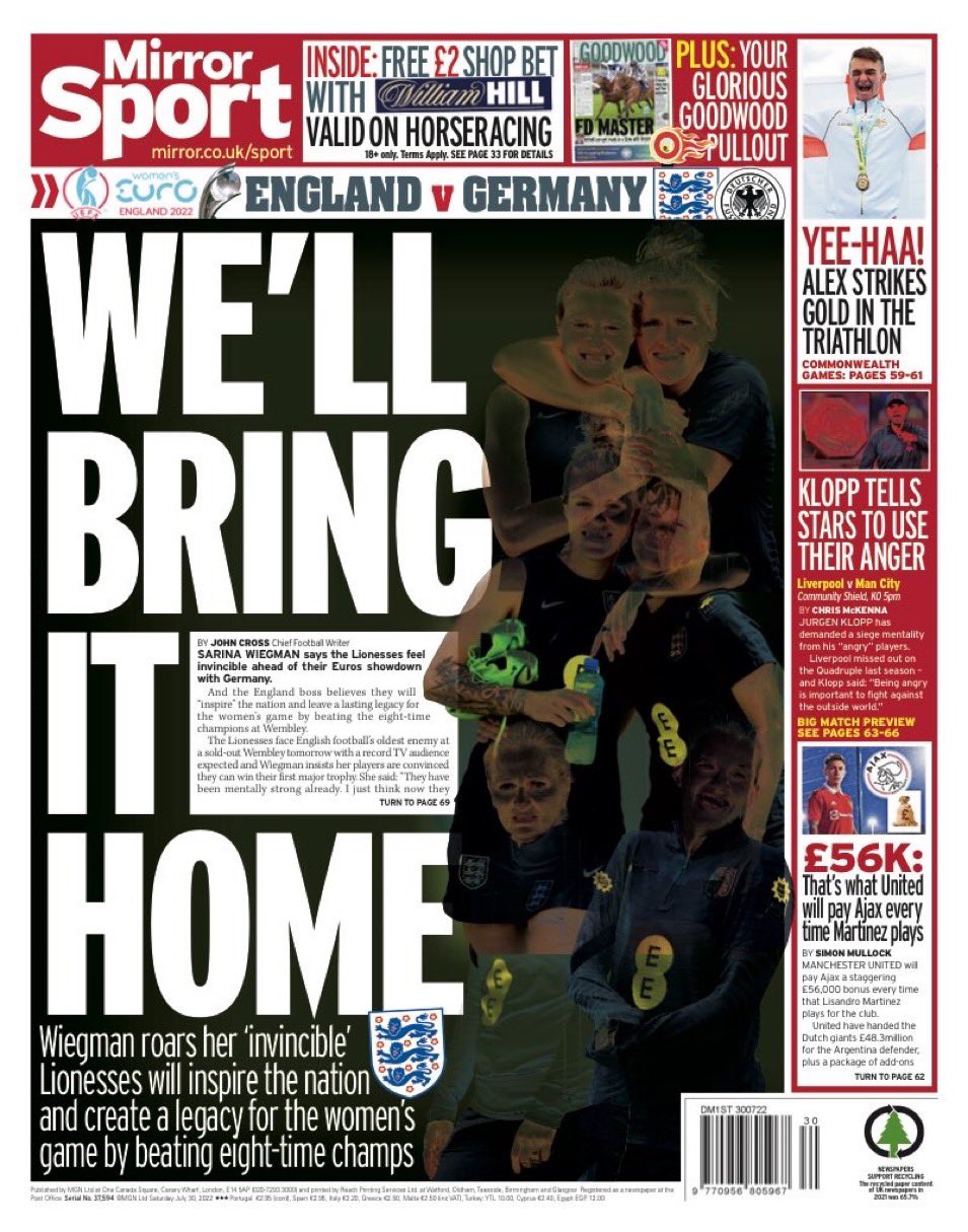 كما عنونت صحيفة "ديلي ميل": "نحن نؤمن.. إنجلترا بإمكانها كتابة التاريخ والفوز بأول لقب كبير"، في إشارة إلى تصريحات سارينا فيجمان، مدرب منتخب إنجلترا للسيدات، قبل مواجهة ألمانيا في نهائي اليورو غدًا.