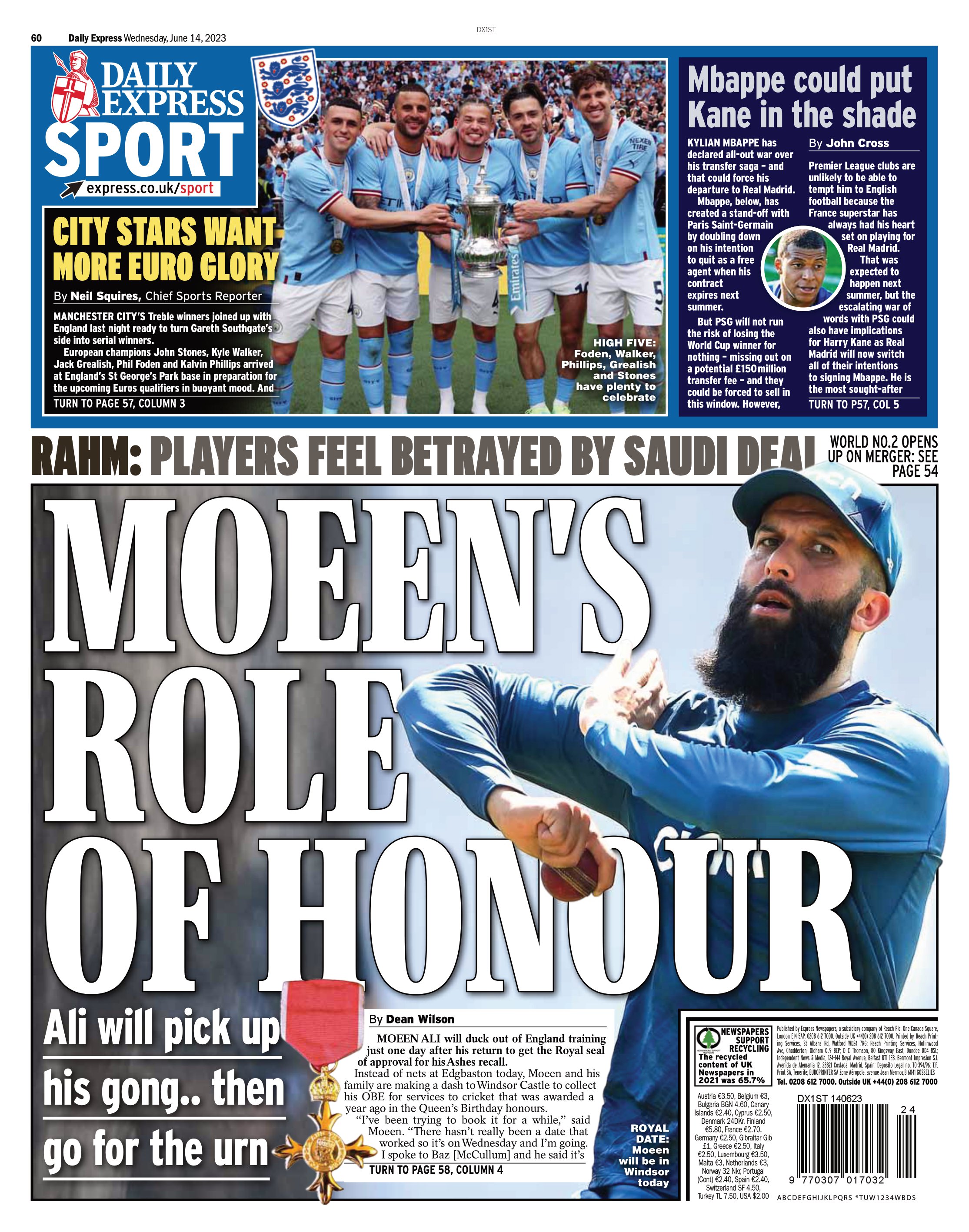 كما عنونت صحيفة ديلي إكسبريس: "مبابي قد يضع كين في الظل"، في إشارة إلى احتمال انتقال النجم الفرنسي لريال مدريد وتأثير ذلك على انضمام النجم الإنجليزي لصفوف المرينجي.