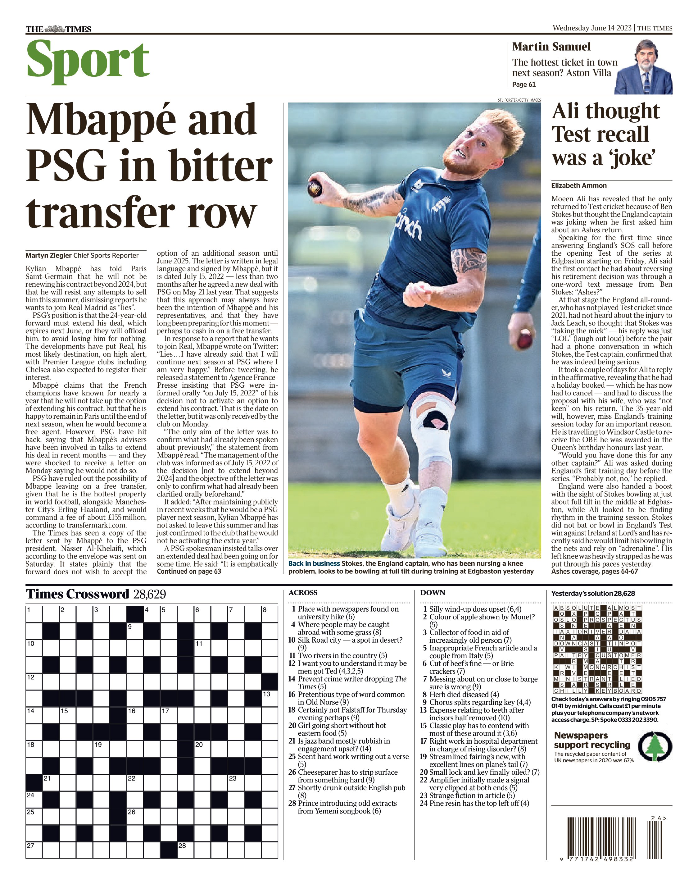 أما صحيفة التايمز فعنونت: "مبابي وباريس سان جيرمان في صراع مرير بشأن الانتقال".