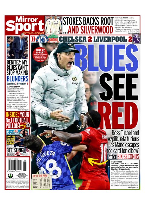 بدورها، كتبت ميرور "المدرب توخيل وأزبيلكويتا غاضبان بعد إفلات ماني من البطاقة الحمراء بعد الضرب بالمرفق".