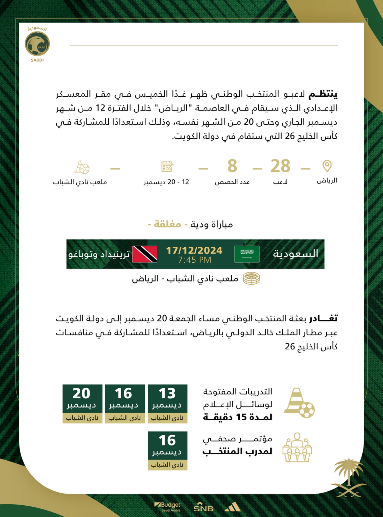 وسيخوض "الأخضر" خلال معسكره في الرياض مواجهة ودية أمام منتخب ترينداد وتوباجو يوم الثلاثاء المقبل على ملعب نادي الشباب. وتقرر أن تكون المباراة مغلقة، حسب بيان رسمي من المنتخب السعودي.