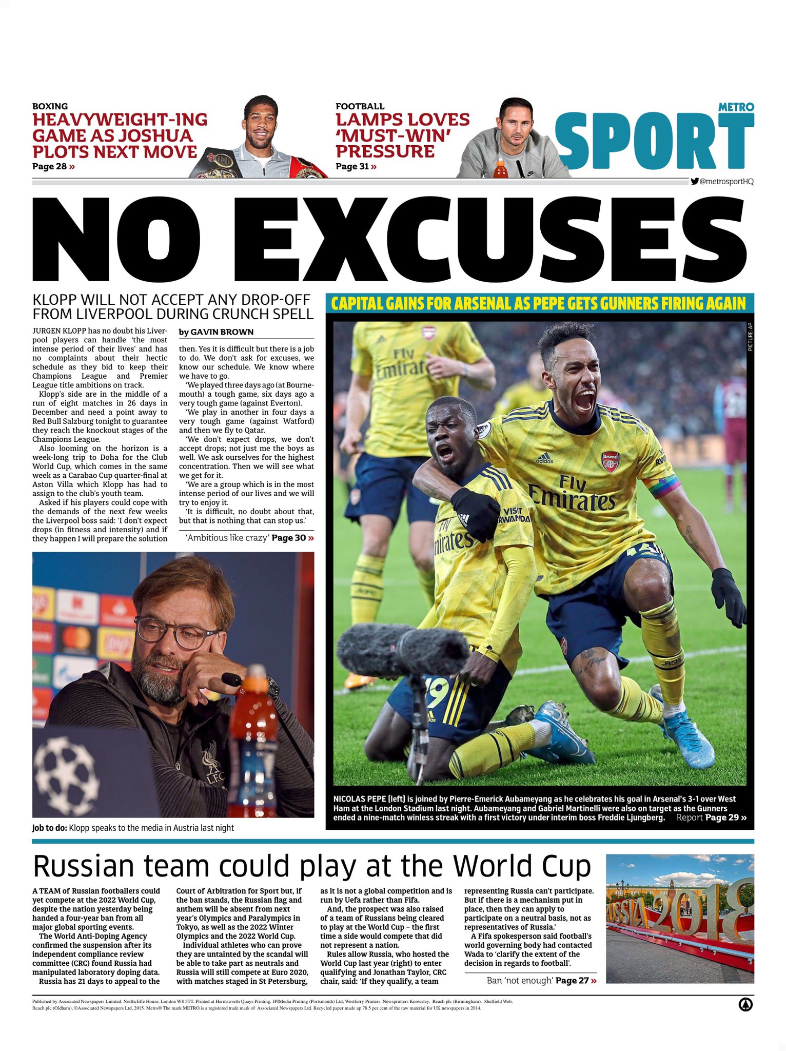 وأتى عنوان صحيفة "مترو": "لا أعذار.. كلوب لن يتقبل أي سقوط من ليفربول".