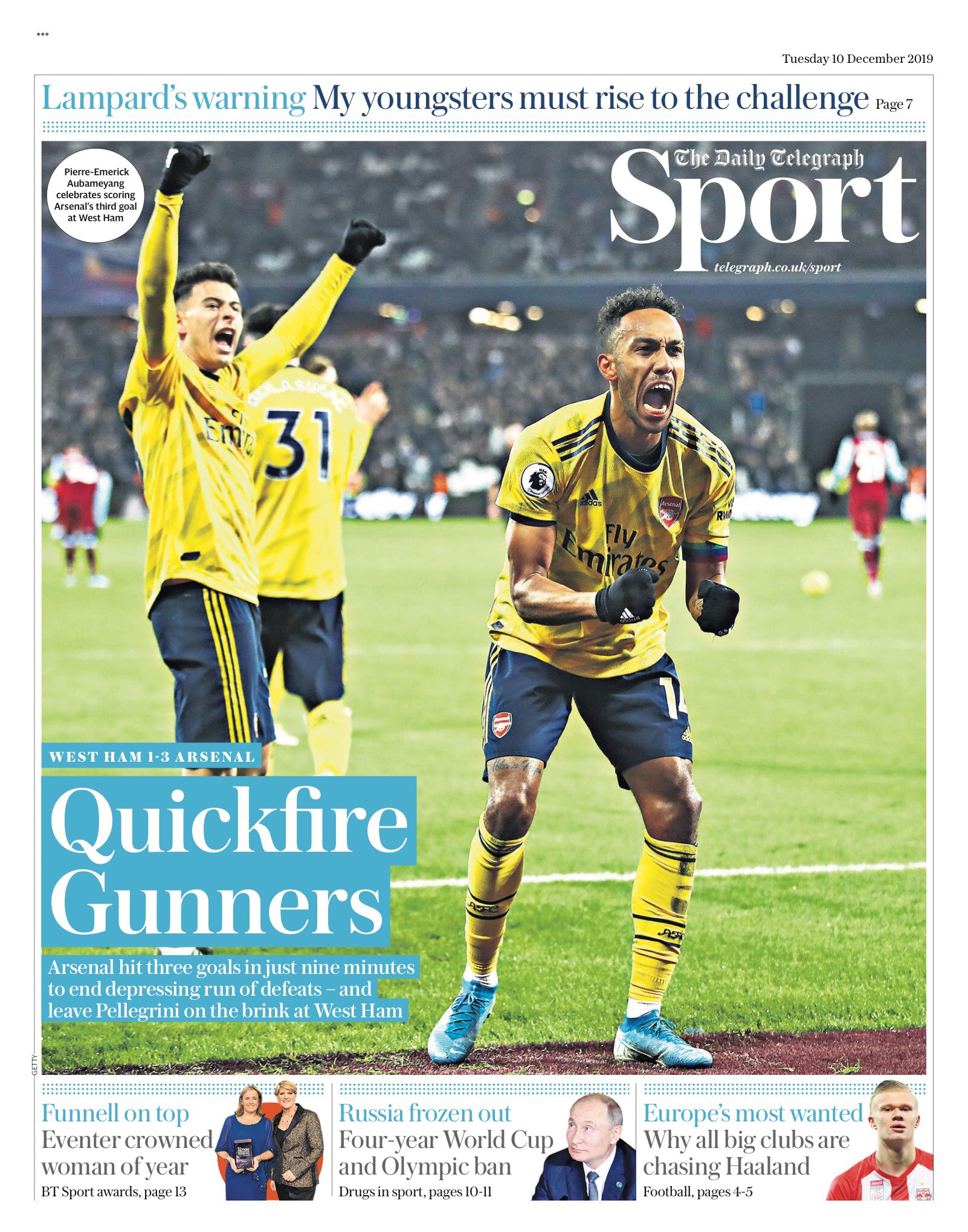 وبدورها كتبت صحيفة "ديلي تيلجراف": "سرعة المدفعجية.. آرسنال يسجل 3 أهداف في 9 دقائق لينهي سلسلة محبطة من الهزائم ويترك بيليجريني على الحافة".