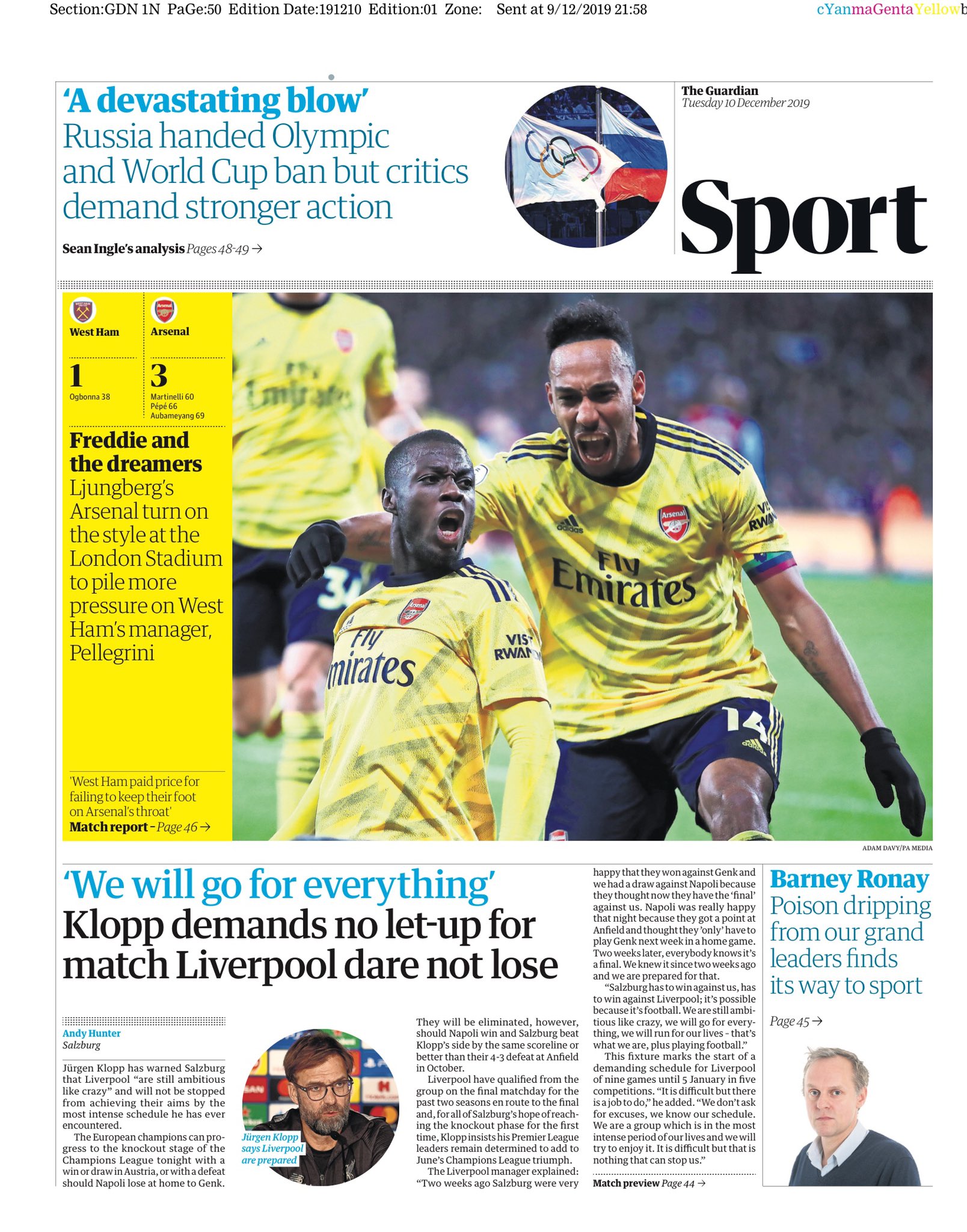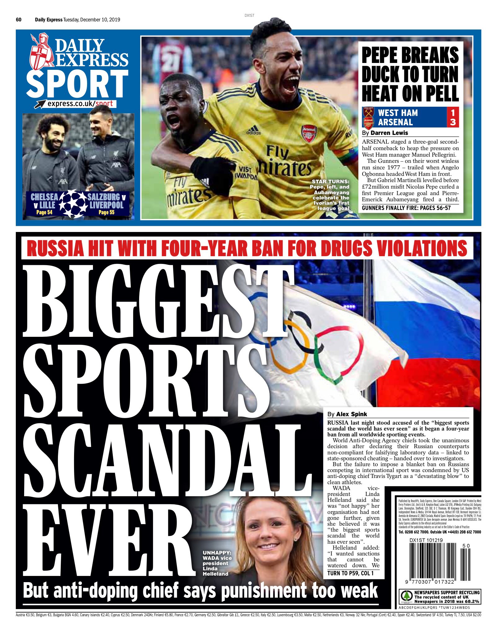 أما صحيفة "ديلي إكسبريس" فعنونت: "الفضيحة الرياضية الأكبر على الإطلاق.. إيقاف روسيا 4 سنوات بسبب انتهاكات المنشطات".