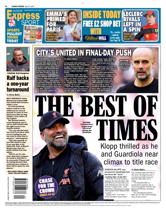 وبدورها عنونت "ديلي إكسبريس": "أفضل الأوقات.. الإثارة تغمر كلوب مع اقترابه هو وجوارديولا من الذروة في سباق اللقب".
