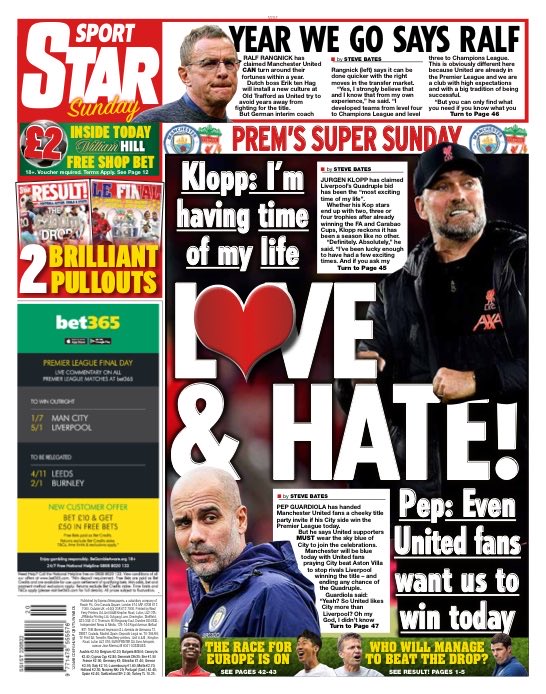 EPAاهتمت الصحف الإنجليزية الصادرة صباح اليوم الأحد، بتواصل التصريحات من قبل بيب جوارديولا ويورجن كلوب، مدربا مانشستر سيتي وليفربول على الترتيب، قبل انتهاء منافسات البريميرليج مساء اليوم وحسم هوية بطل المسابقة بينهما.
