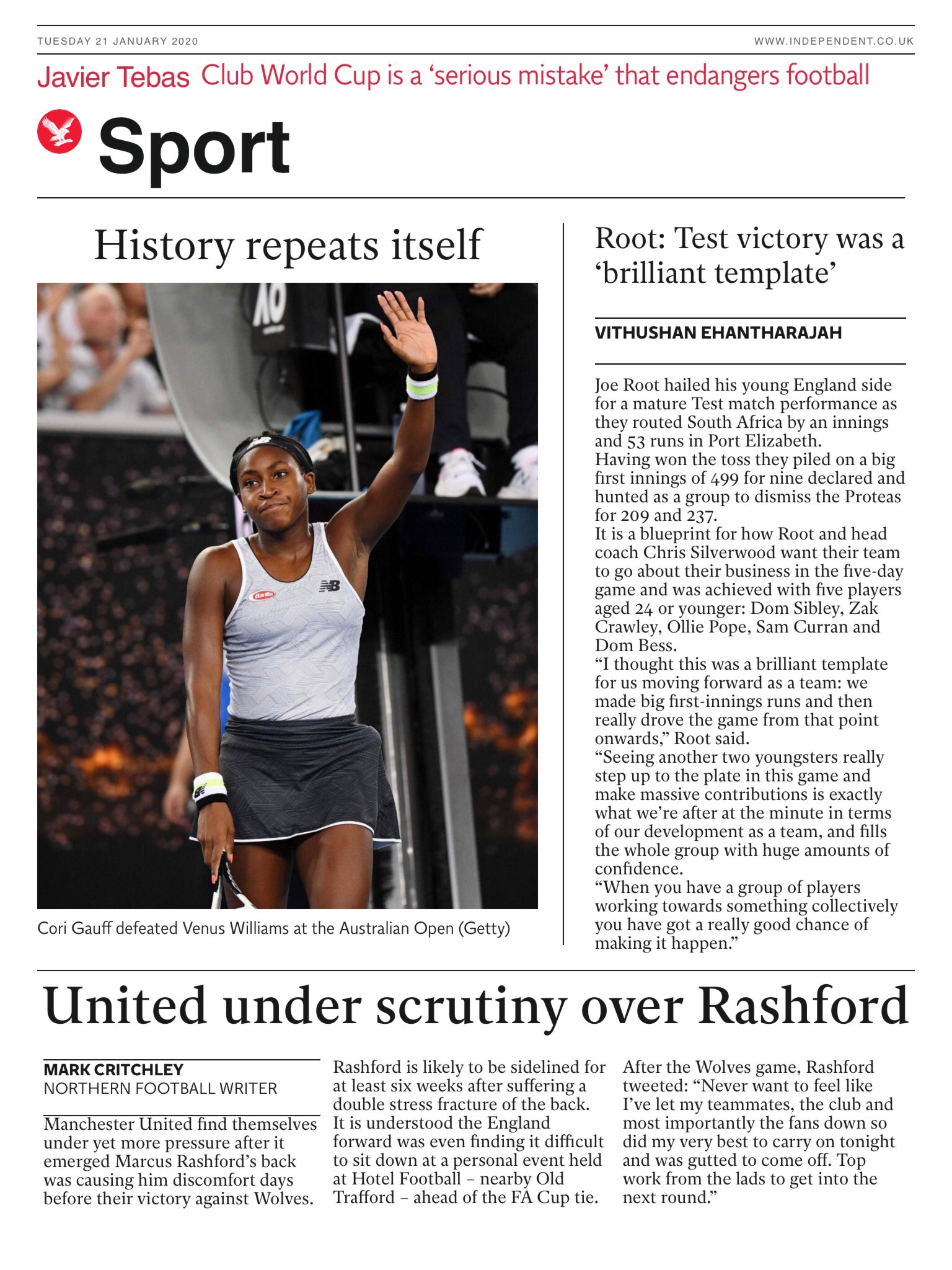 أما صحيفة "إندبندنت" فعنونت: "التاريخ يعيد نفسه"، وذلك في إشارة إلى تغلب كوكو جوف على فينوس ويليامز في بطولة أستراليا المفتوحة للتنس.