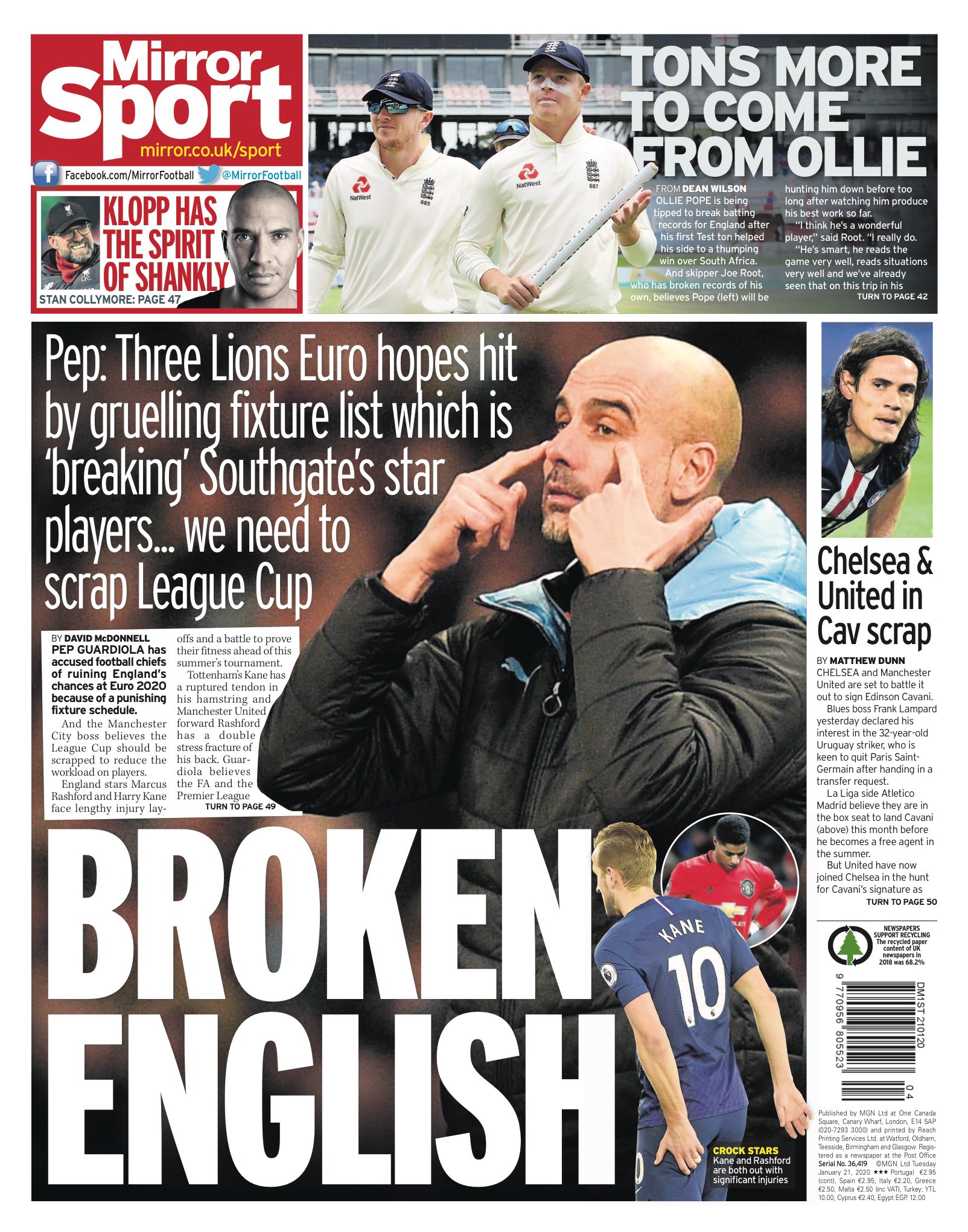 واتفقت صحيفة "ميرور" مع "ديلي إكسبريس" بعنوان: "إنجليزي محطم.. بيب: آمال الأسود الثلاثة في اليورو تصطدم بقسوة جدولة المباريات التي تحطم نجوم ساوثجيت.. نحتاج للتخلص من كأس رابطة الأندية المحترفة".