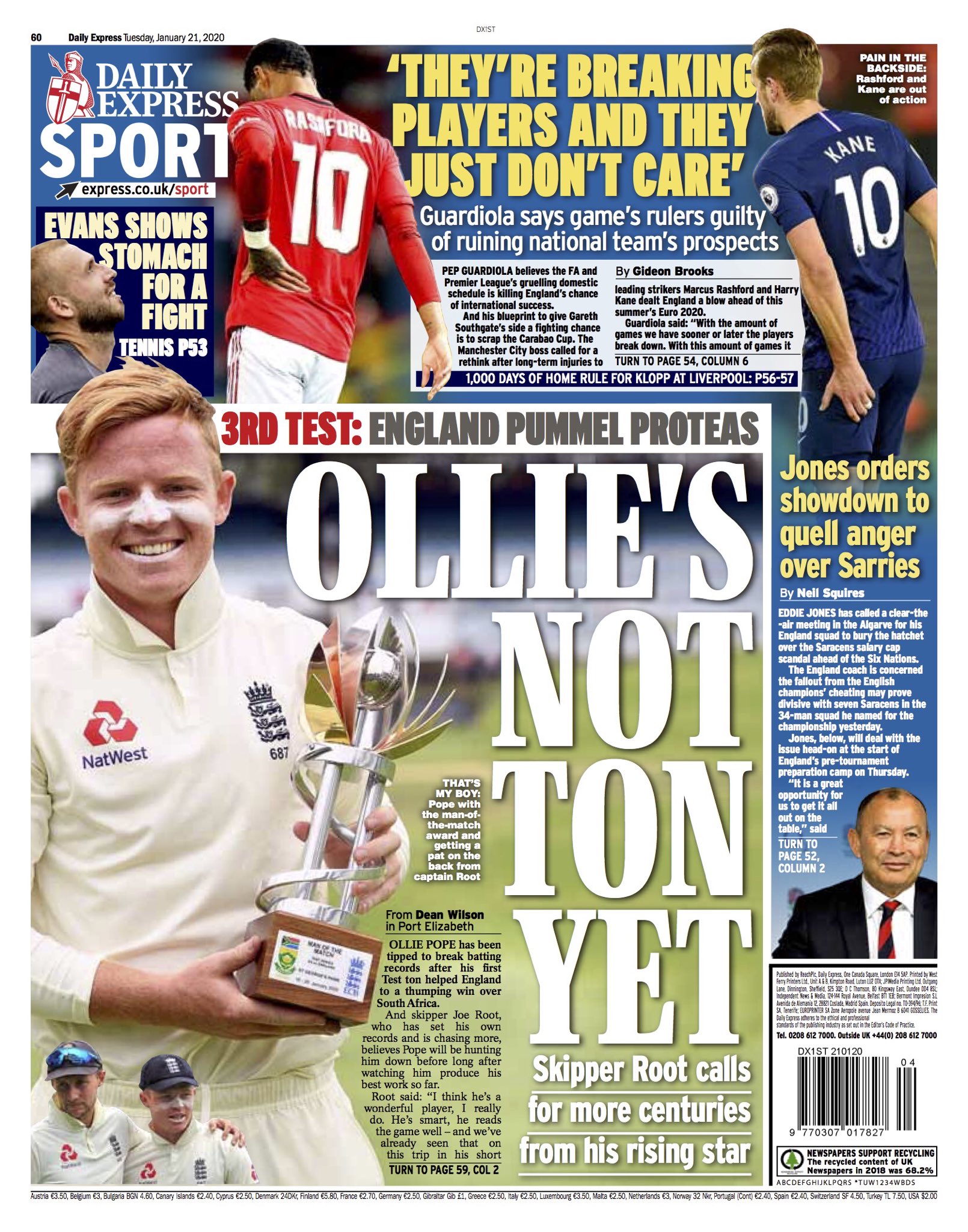 وكتبت صحيفة "ديلي إكسبريس" على لسان مدرب مانشستر سيتي: "يحطمون اللاعبين ولا يهتمون.. جوارديولا يتهم مسؤولي اللعب بتحطيم آمال المنتخب الإنجليزي"، وذلك في إشارة منه إلى أن جدولة المباريات تقتل طموحات "الأسود الثلاثة"، في تحقيق النجاحات الدولية، بعد إصابة كل من هاري كين وماركوس راشفورد قبل شهور قليلة من انطلاق يورو 2020.