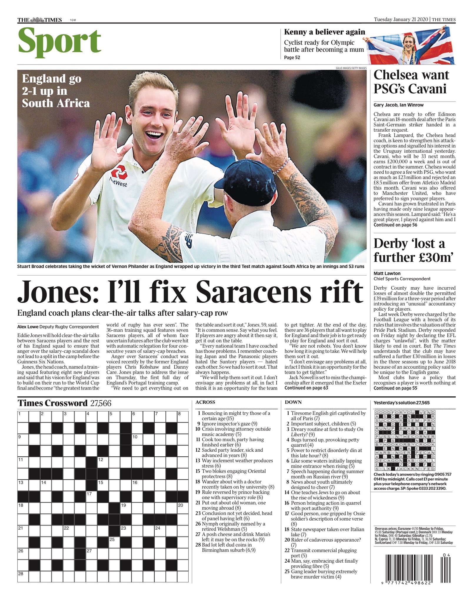 أما صحيفة "التايمز" فاهتمت برغبة تشيلسي في التعاقد مع إدينسون كافاني مهاجم باريس سان جيرمان، لمدة 18 شهرًا، خاصة أن عقده مع الفريق الفرنسي ينتهي الصيف المقبل.